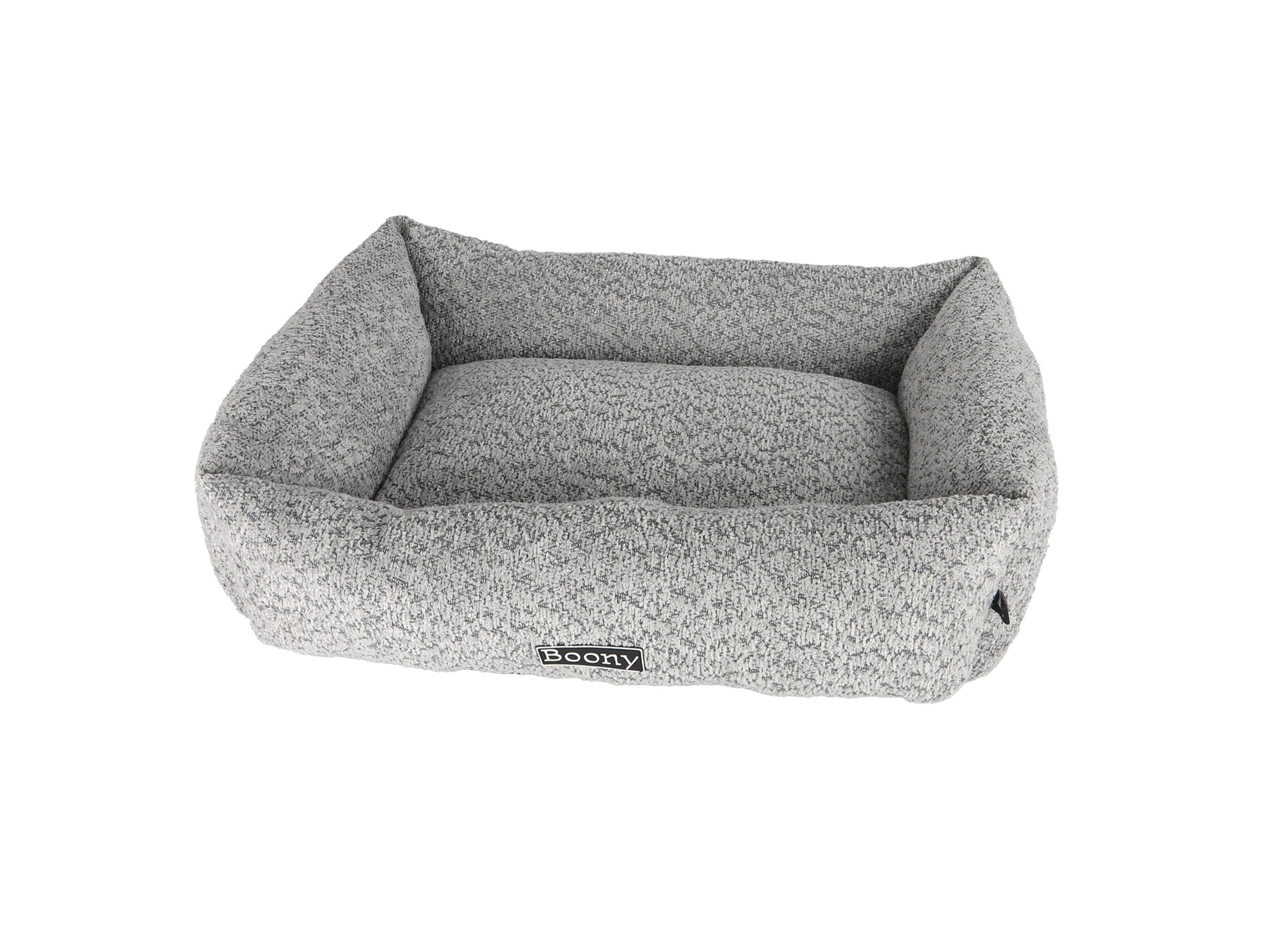 Boony lounger chenille grijs/blauw is een stijlvolle en comfortabele rustplek voor katten en honden, met zachte vulling en opstaande randen.