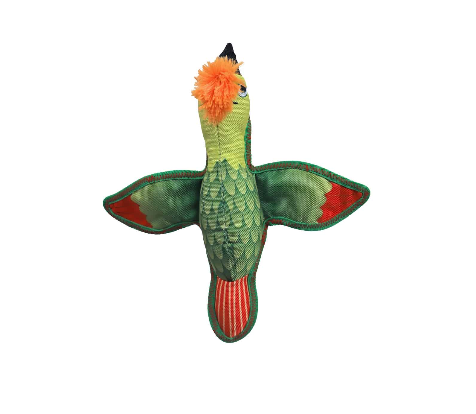 Nylon paradijsvogel met piep. Voorzien van pluche kuif en vleugels in de vorm van “flapjes” voor extra attractiviteit.