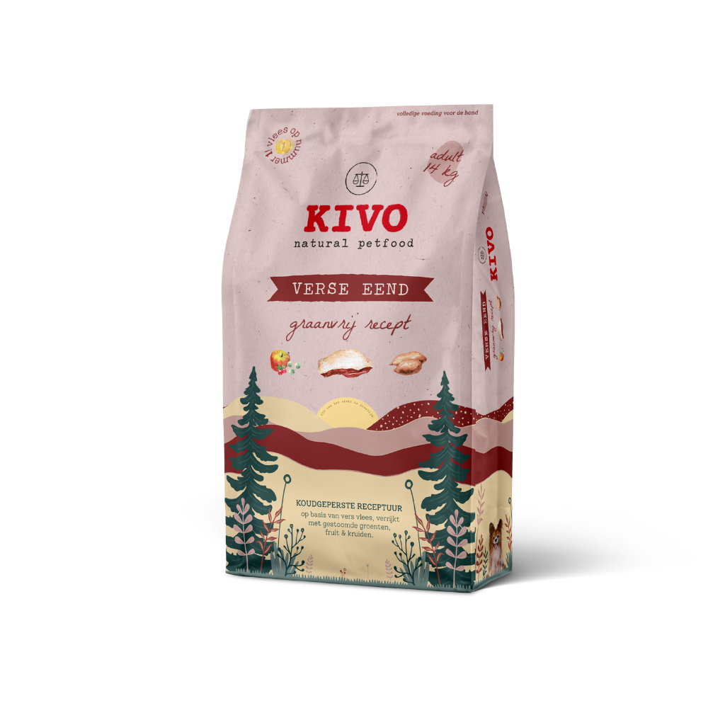Kivo Verse Eend Graanvrij is een koudgeperste, hypoallergene brok met 73% dierlijke eiwitten voor gevoelige honden.