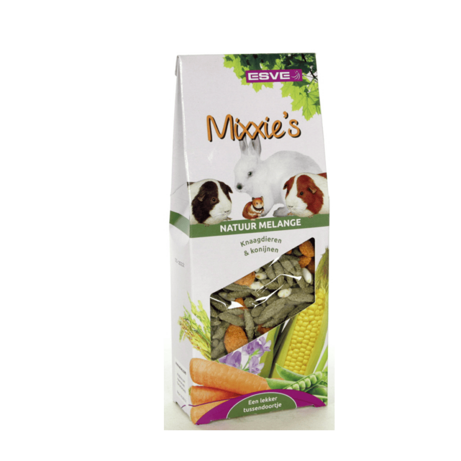 Mixxie’s zijn heerlijke en gezonde tussendoortjes met belangrijke voedingsstoffen, die uw knaagdier verwennen. Bevordert tevens de spijsvertering en knaagbehoefte. Aanvullend diervoeder voor hobby konijnen en knaagdieren.