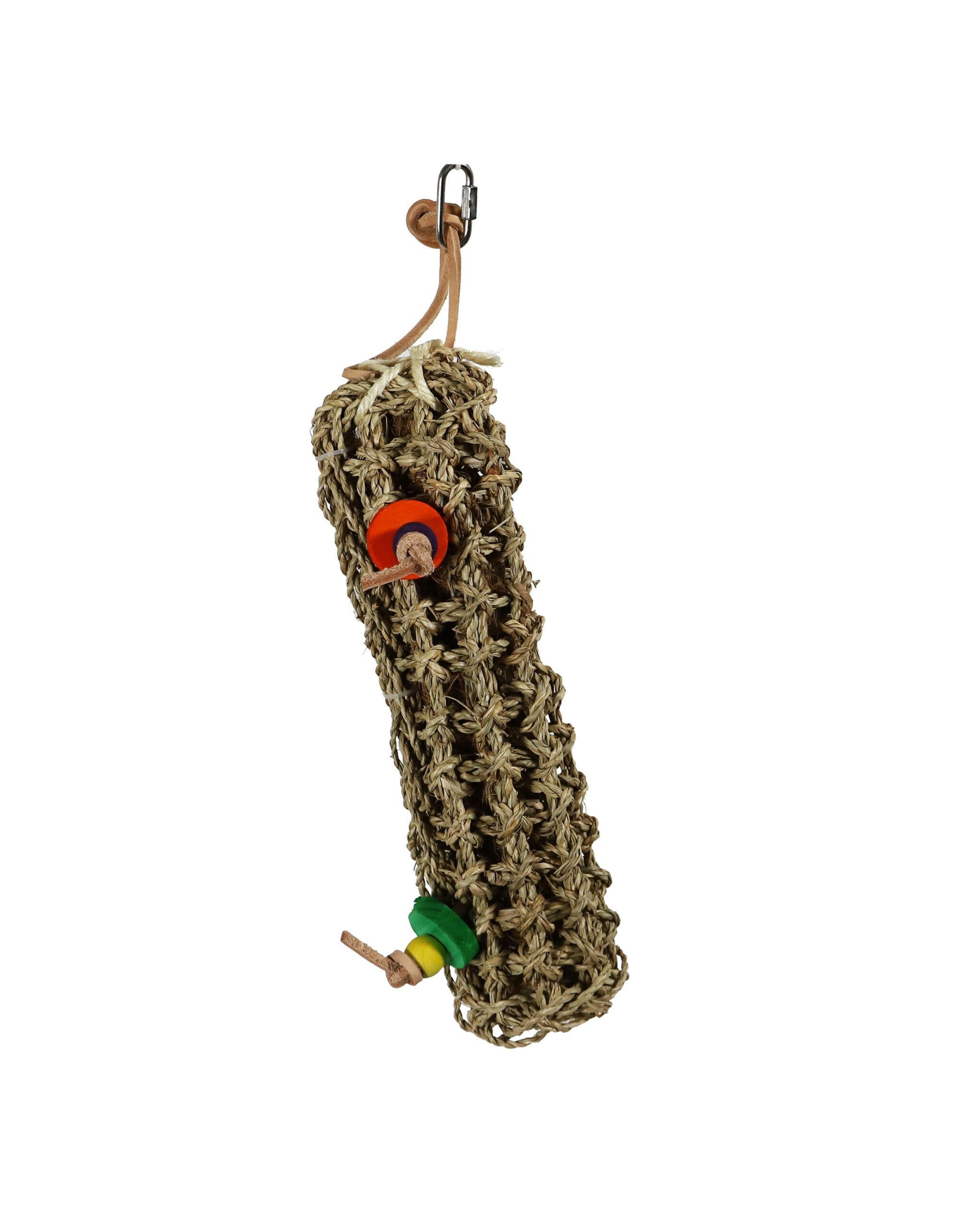 Dit multifunctionele vogelspeelgoed is perfect voor vogels die graag peuteren, knagen en nestmateriaal verzamelen. De zeegrashuls is gevuld met kokosvezel die jouw vogel spelenderwijs eruit kan trekken. De kleurrijke houten schijfjes en kralen maken het speeltje extra aantrekkelijk en uitdagend.
